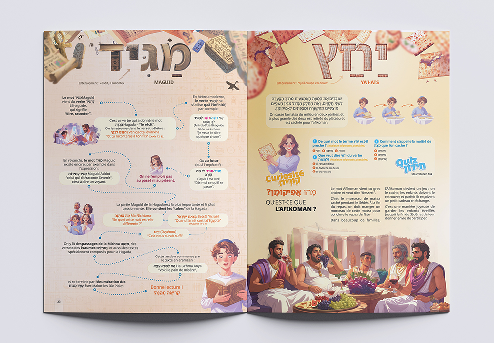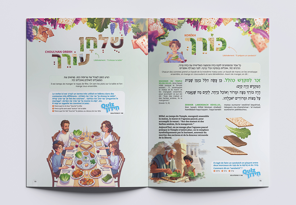 Des vocabulaires ciblés et des verbes essentiels sur le thème de Pessa’h transforment le Séder en véritable moment d’apprentissage linguistique, sans alourdir la lecture.